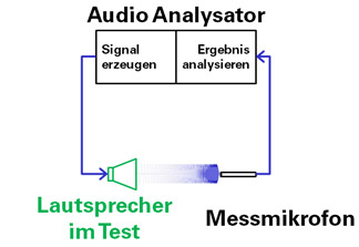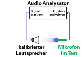Ganz ähnlich sieht ein geschlossener Mikrofon-Test aus, bei dem wir das Mikrofon direkt an den Analysator anschliessen. Das Testsignal wird durch einen kalibrierten Lautsprecher wiedergegeben, und das Mikrofon-Signal vom Analysator aufgenommen.