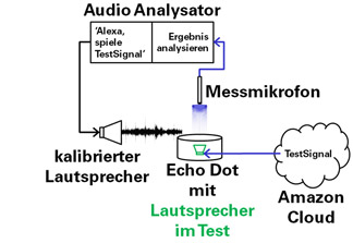 Für die Prüfung eines Lautsprechers im Amazon Echo steht kein elektrischer Anschlus am Gerät zur Verfügung. Das Testsignal wird daher aus der Amazon Cloud heruntergeladen. Da der Generator nicht direkt mit dem zu prüfenden Lautsprecher verbunden ist, wird ein sogenannten offenen ('Open Loop') Testaufbau anwendet.