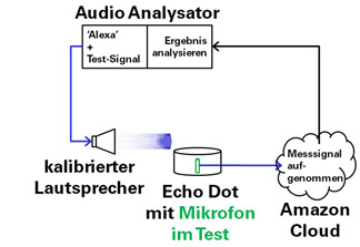 Für die Prüfung des Mikrofons im Amazon Echo steht ebenfalls kein elektrischer Anschluss zur Verfügung. Daher wird das vom Echo Mikrofon aufgenommene Testsignal in der Amazon Cloud zwischeng dem Mikrofon verbunden ist, wird diese Konstellation als offener ('Open Loop') Mikrofon-Test bezeichnet.