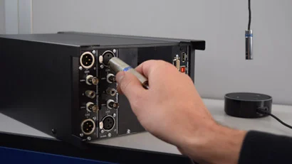 Ebenso wird bei einem Mikrofontest mit geschlossenem Regelkreis der Analysator direkt mit den Kabeln auf der Rückseite des zu prüfenden Mikrofons verbunden. Wir spielen das Testsignal über einen kalibrierten Lautsprecher ab und die Reaktion des Mikrofons wird vom Analysator aufgezeichnet.