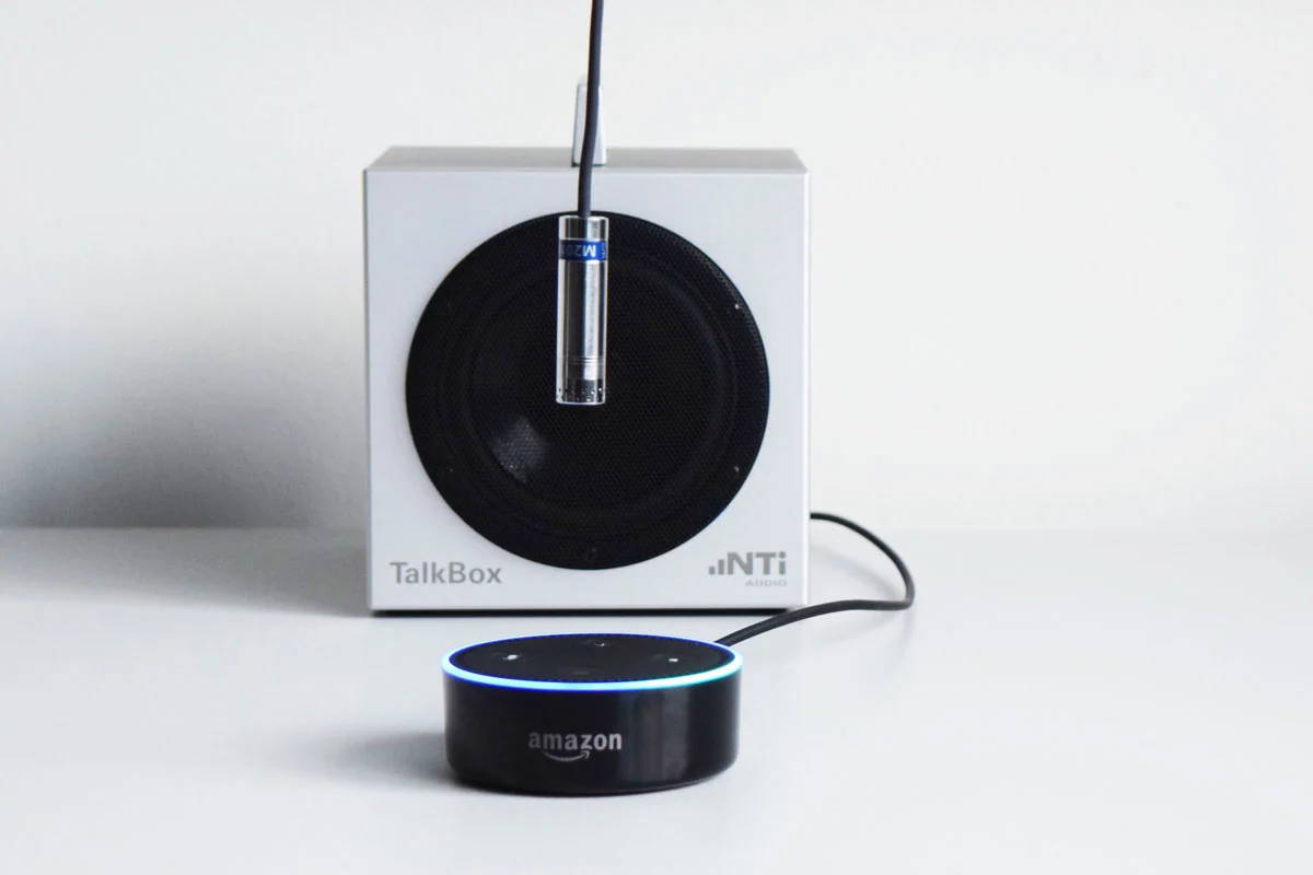 Platzieren Sie die NTi Audio Talkbox vor dem Amazon Echo Dot und schließen Sie sie an den FX100-Ausgangskanal 1 an.