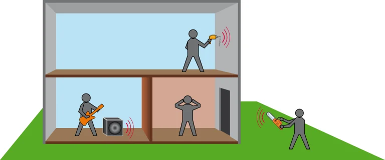 Typischerweise werden verschiedene Geräusche im Inneren eines Gebäudes erzeugt. Einige werden von Menschen erzeugt (Sprechen, Musik, Baulärm), andere stammen von fest installierten Maschinen oder Geräten (Belüftung, Heizung, Waschmaschinen usw.).