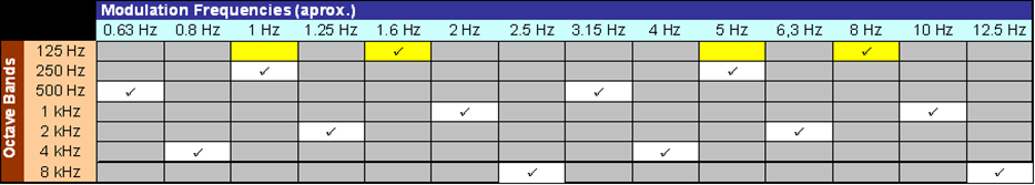 - Ungültige Modulationsverhältnisse in den einzelnen Oktavbändern (mr1 oder mr2 > 1,3)