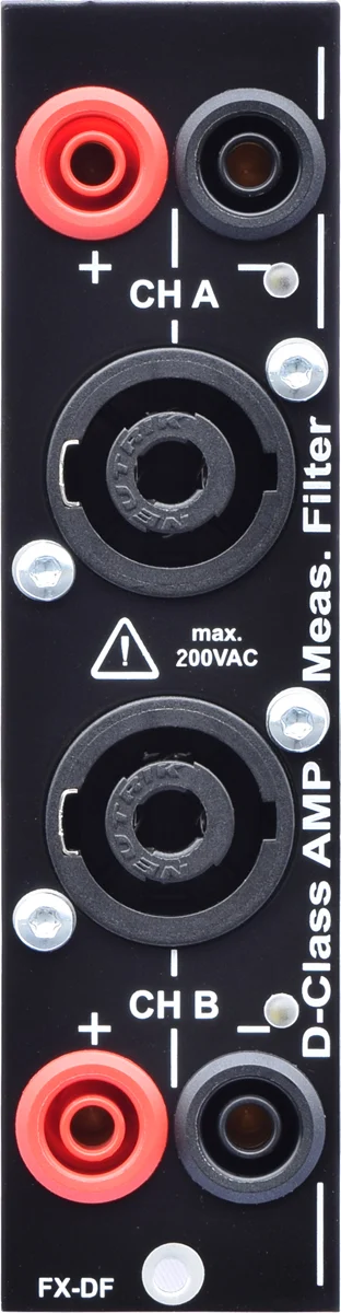 The FX-DF module comprises two analog filters that are linked to the output signals of the amplifier under test. A load (substituting the impedance provided by the speakers in normal operation) is connected to the test system through banana plugs. The filtered signals are automatically routed internally to the two analysis channels.
