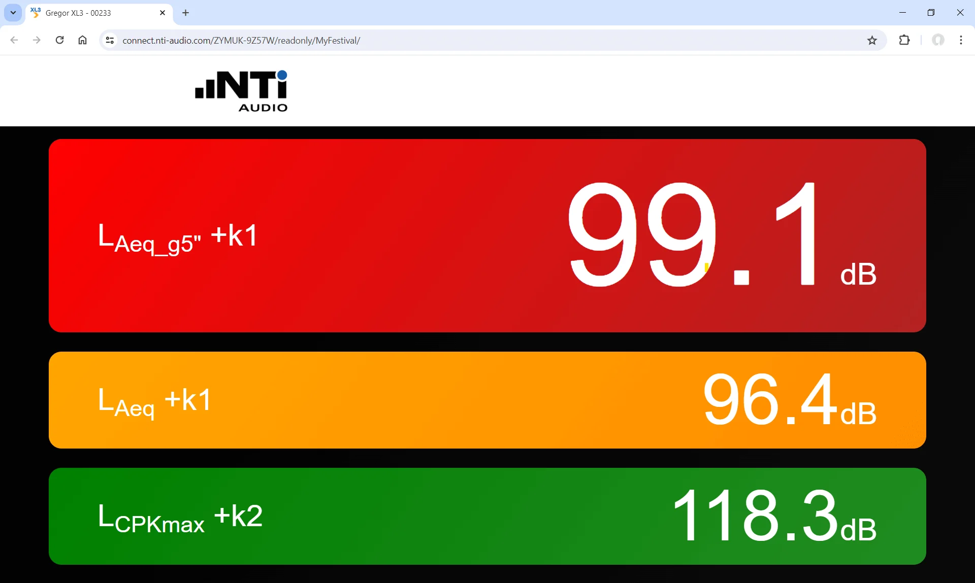 Every XL3 has an online, built-in large screen (XL-View) mode, which continuously streams three selectable levels together with freely-definable limits. Warnings, when levels are near or exceeding the limits, are clearly visualized with orange or red backgrounds. The levels are available for free to display in any browser.