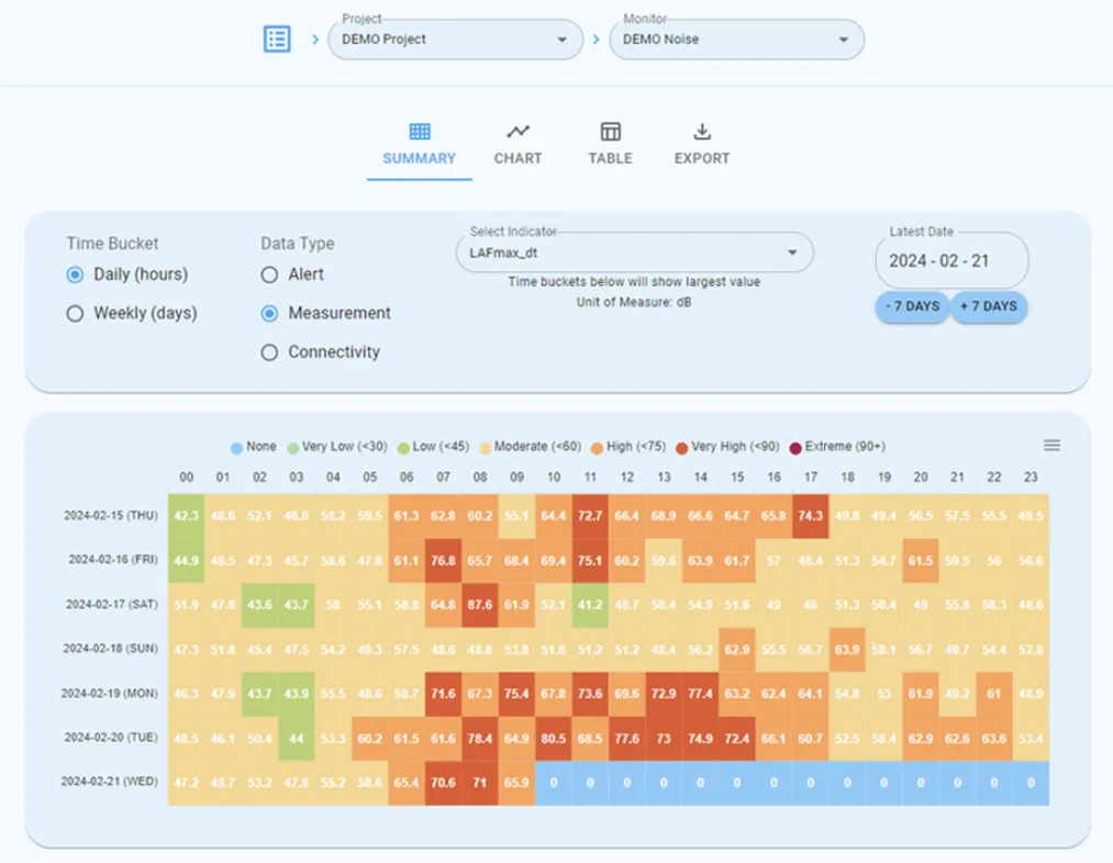 MeasurEye provides simple event evaluation, based on 1-second data, such as exceeding noise level limits (e.g. LAeq_dt > 70 dB) or combines multiple measurements to provide a more comprehensive assessment, providing meaningful alarms in complex environmental conditions.
