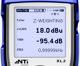 The XL2 with balanced XLR and unbalanced RCA inputs offers a comprehensive, high performance audio analyzer. It simultaneously measures balance, level, distortion (THD+N) and frequency. The internal loudspeaker or headphone output offers audible monitoring of either the input signal or just the residual distortion. The optimized low distortion and low noise design enable level measurements down to -112 dBu and residual distortions typically lower than -100 dB, which is unmatched in handheld instruments.