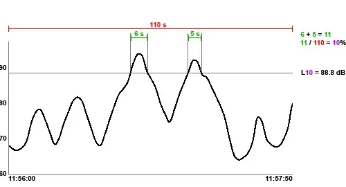 For example, L90 describes the level which was exceeded for 90% of the time. That is, for 90% of the time for the period measured, the noise level was at least above the L90 level. The L90 level is often used as an approximation of the background noise level. On the other side of the scale, L01 describes the level which was exceeded for only 1% of the time. That is, for 1% of the time for the period measured, the noise level was at least above the L01 level. The L01 level is sometimes used as an approximation of the maximum level Lmax.