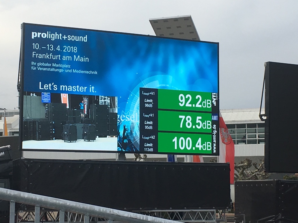 09. May 2018 Great Sound at Europe`s biggest Live Sound Trade Fair The annual ProLight + Sound trade fair (PLS) in Frankfurt is acclaimed for Live sound demonstrations from top PA system manufacturers. This year the “Agora Live Sound Arena”, in the middle of the exhibition halls, was again a big attraction. While the various manufacturers presented their large-scale PA systems and latest stage equipment under realistic conditions at this open-air venue, the acoustic engineering company AMT, Isernhagen was responsible for protecting the public’s hearing according to the DIN 15905-5 standard. All sound level measurements were performed with the XL2 Sound Level Meter and visualized on the rather big screen using the Projector PRO software. The Live Sound Arena was once again a crowd-puller this year. There is no doubt that, within reason, “louder is better” in such a comparative demonstration environment. AMT's job was to measure and display the sound levels, as well as advise the exhibitors on what is possible within the legal limits . For the sound level measurement, AMT chose the XL2 Sound Level Meter, because it is compliant, can integrate with the big screen, and provides a clear traffic-light color warning system. Sound or Noise? At such a significant music fair, visitors expect crystal-clear sound with rich bass even at high volumes, regardless of the genre of music played. In order to provide such a sound experience for the visitors without adverse health effects, and to offer the same conditions to each of the manufacturers in their fight for attention, the AMT acousticians pushed levels to the max during the audio presentations. “Maintaining the levels is important to get the job done properly. We aim at providing the best possible sound. This means that we have to respond flexibly to the different wishes of the exhibitors during the presentation, as each sequence is structured differently with speech and music components”, says Michael Oehlerking, Managing Director of AMT. Since this Frankfurt trade fair is located in the city center, it is surrounded by public infrastructure and office buildings. This proximity creates special challenges with “loud events”. Thus, the sound systems had to be aligned in such a way that it was still possible to work relatively undisturbed in the offices of the neighboring buildings. Level monitoring in open-air presentations The German DIN 15905-5 standard requires that the sound levels be monitored at the loudest position in the audience area. This is often right in the middle of the crowd. Placing a measurement microphone at this position makes no sense; it may get in the way of the crowd and will measure the crowd noise on top of the event sound. Measuring crowd noise is not required by the standard and can have a detrimental effect by reducing the headroom in the event sound maximum levels. Therefore, the measurement microphone is placed away from the crowd, directly in front of the speakers, i.e. hung in front of the line array. The correction values k1 and k2 between these two positions (the measurement position and the loudest position) are then determined during setup with the XL2. During the event, the XL2 corrects the measured values and displays the loudest position's live values. By optimizing the alignment of the speakers and the level limits, a compromise was found that suited the organizers, residents and the public. ”Because of the changing weather and the dynamic flow of visitors during the four days of the fair, we had varying conditions at the venue. Thanks to the professional technicians and good planning, these fluctuations could be well compensated”, Oehlerking proudly reported. The feedback from the visitors was also very positive. The great demonstrations were enhanced by the big screens providing a mix of exhibitor information, live stream and sound level values. Further links to the topic: More about Live Sound Solutions Read more about on their Website Download the press pictures here Get this press article in RTF format! Categories: Live Sound Tags: