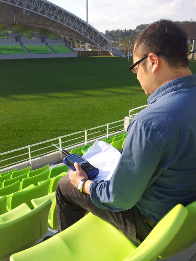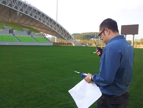 09. January 2014 Namdong Stadium Commissioned for Asian Games 2014 Inchon, South Korea: The Namdong Stadium, which will host the upcoming Asian Games 2014, was commissioned using the handheld XL2 Analyzer. The newly conceptualized stadium will showcase the Asian Games 2014 rugby tournament. The Korean installation specialist Sovico opted for the handheld XL2 Audio and Acoustic Analyzer to commission the new public address system in the Namdong Rugby Stadium, located in the south-east of Inchon. The goal was to measure the speech intelligibility and the sound pressure level generated by the new installation for the anticipated crowd and athletes. The measurements were performed by Gun Chang Moon M.Sc., Senior Audio & Acoustic Consultant of Sovico and his team, utilizing the combination of the NTi Audio Minirator MR-PRO and the XL2 Acoustic Analyzer. Prior this final testing Mr. Moon verified, with these instruments, the polarity and the balanced signal quality of all speakers. He also optimized the announcement system’s acoustic performance utilizing these handheld instruments. 42 Reference positions throughout the Stadium Within the seating area (capacity 8100 persons), Mr. Moon assigned 33 representative measurement points. A further 9 measurement points were selected on the field. The Minirator was connected to the audio system in the audio control room and generated the dedicated speech intelligibility test signal. The test signal was broadcasted throughout the stadium at the default announcement level. The XL2 simultaneously measured both the speech intelligibility and sound pressure level at the assigned locations. The append mode of the XL2 provides automated data recording mapped to the grid of measurement points. Speech Intelligibility up to 0.84 STI The sound pressure levels ranged from 77 dB at the outside seats up to 90 dB around the middle area with more than 95% of the seating area providing speech intelligibility higher than 0.55 STI. At the middle seating area Sovico even measured up to 0.84 STI, which is exceptional for a stadium environment. On the field itself, a speech intelligibility of 0.75 STI was achieved on average with an sound level distribution of +/- 3dB. These satisfactory results confirmed the excellent performance of the new public address system in the Namdong Stadium. Time Saving Documentation After this project Mr. Moon reported: “Thanks to the handheld XL2 Acoustic Analyzer I was able to verify the speech intelligibility of the entire stadium within less than one hour. Additionally the automated result documentation offered by the XL2, mapped to the pre-determined grid saved a lot of time in producing the final reports to our customer.” The audience and athletes at that upcoming Asian Games can expect optimized speech intelligibility in the Namdong Stadium. More information at www.nti-audio.com/XL2 www.sovico.co.kr Press Picture(s) for download here. Categories: Archive Tags: