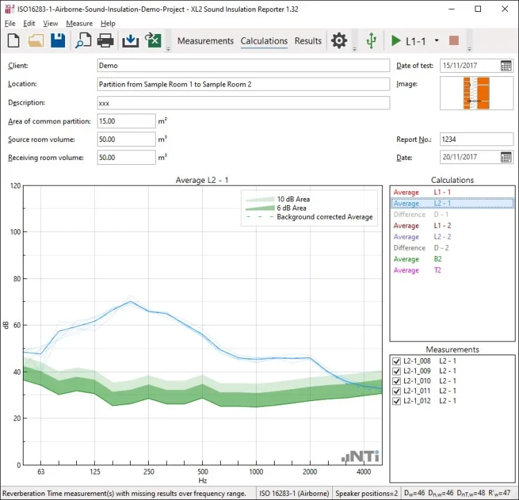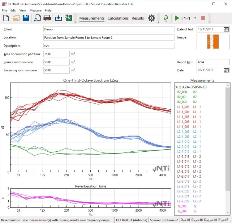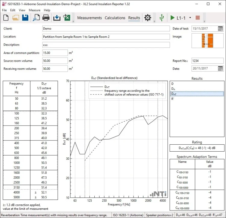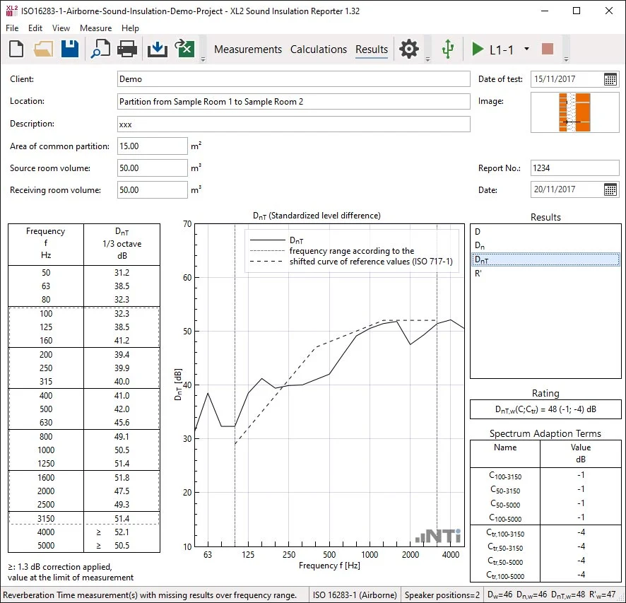 - Standards ASTM E336, ASTM E413, ASTM E1007, ASTM E989, ASTM E966, ASTM E1332, BB93, DIN 4109, Document E, GB/T 19889, ISO 16283, ISO 140, ISO 717, ISO 10140, NEN 5077:2019, SIA 181:2006, SIA 181:2020