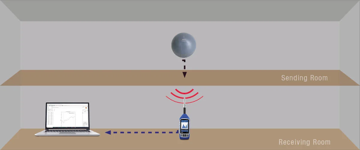 Typically, the ball is used on building elements like stairs or wooden floors and is dropped vertically from a height of 1 m (± 1 cm) at several positions. The Sound Pressure Level is measured in the receiving room with a Sound level Meter like XL2 or XL3. In combination with the Sound Insulation Reporter software the evaluation of measurements and the reporting.