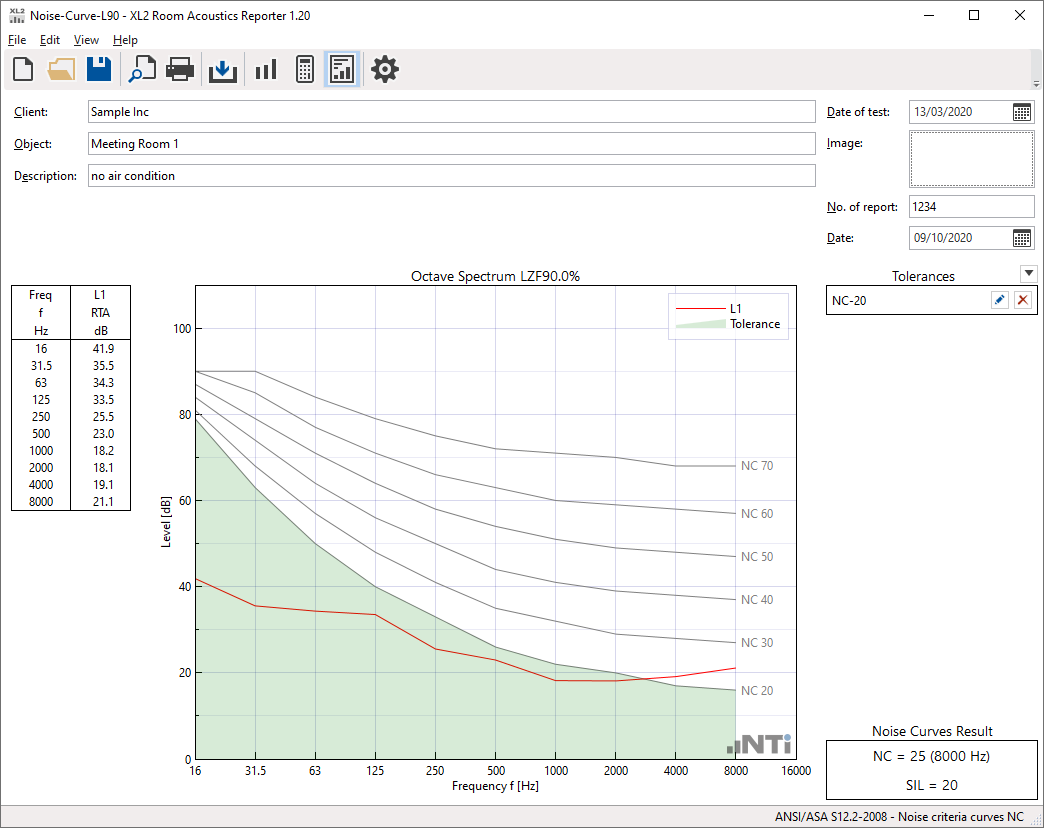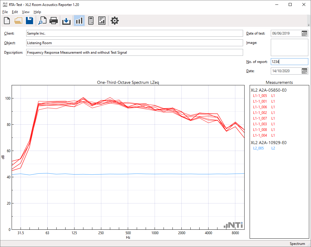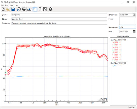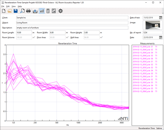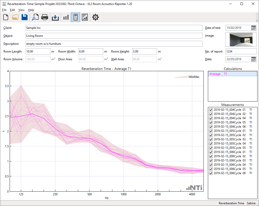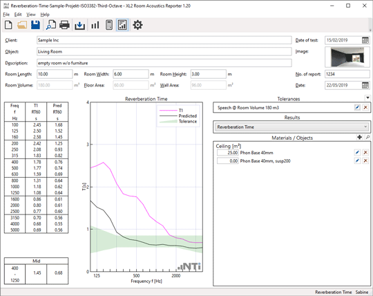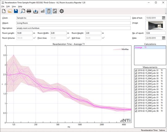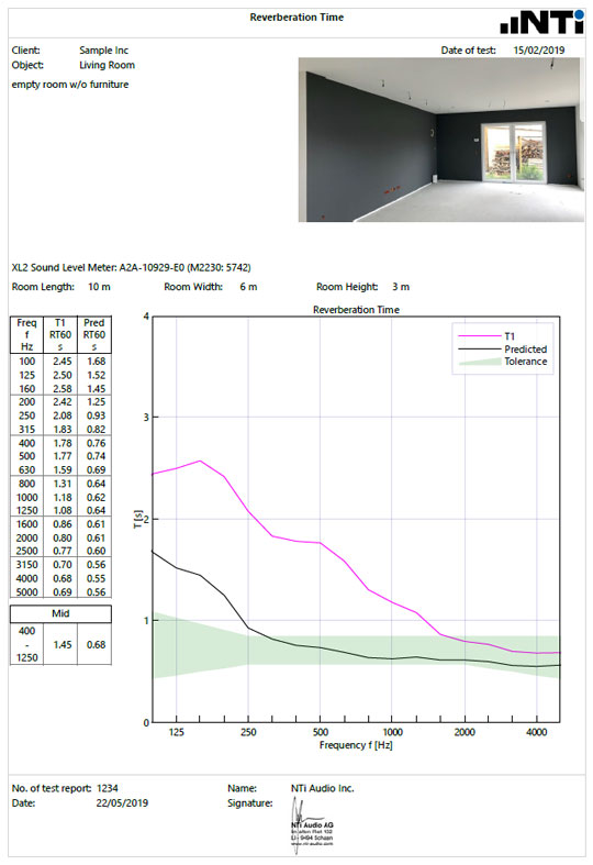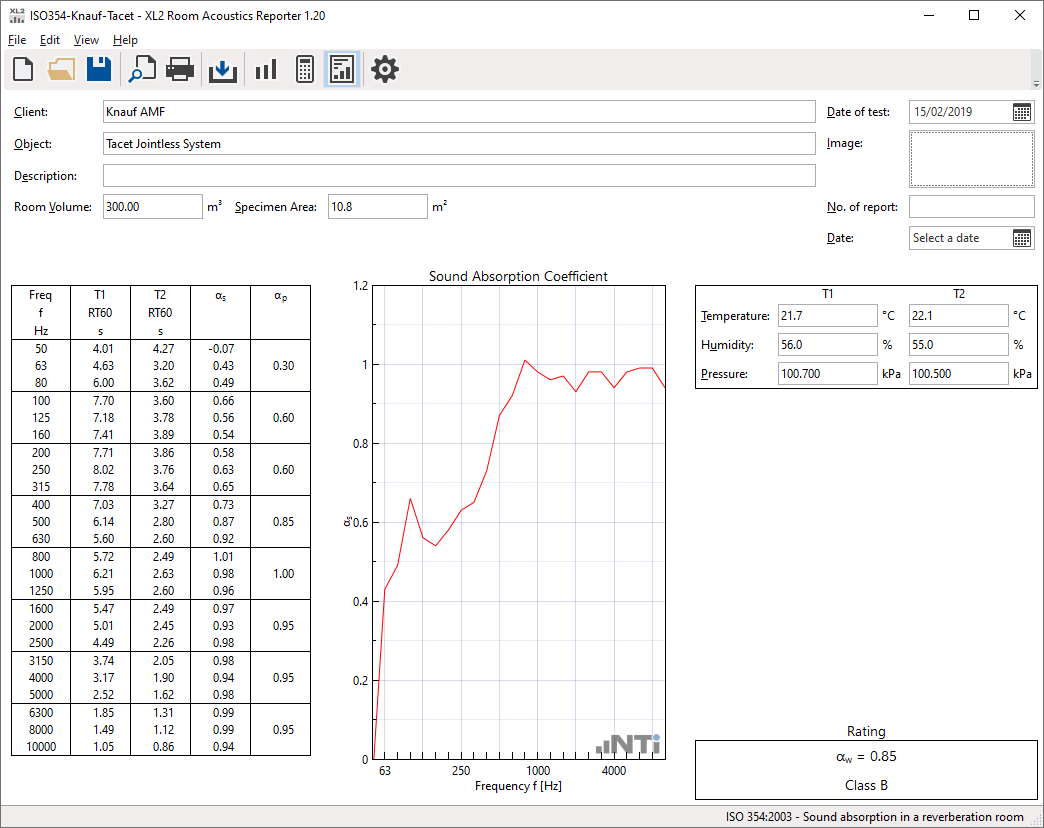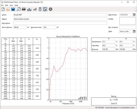 The reverberation time is measured with the Sound Level Meter, with and without absorbers in the room. Based on this data, the Room Acoustics Reporter software calculates the sound absorption coefficient according to the ISO 354, ISO 11654 and ASTM C423 standards. The standardized measurement report also gives the sound absorber class A-E and the single-number values NRC (Noise Reduction Coefficient) and SAA (Sound Absorption Average).