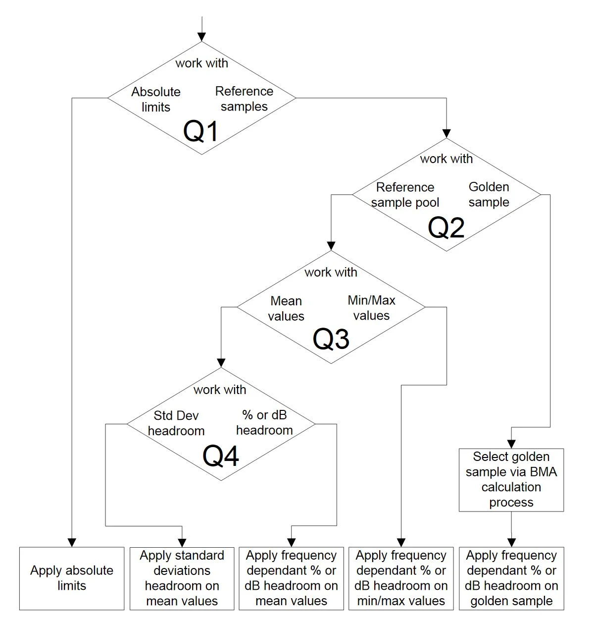 Defining limits for testing an acoustic device can be more challenging than you might have thought. There are various methods and strategies. The first major decision to be taken is whether to work with absolute limits or to use one or several reference samples. The following diagram illustrates the decision process.