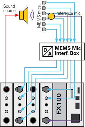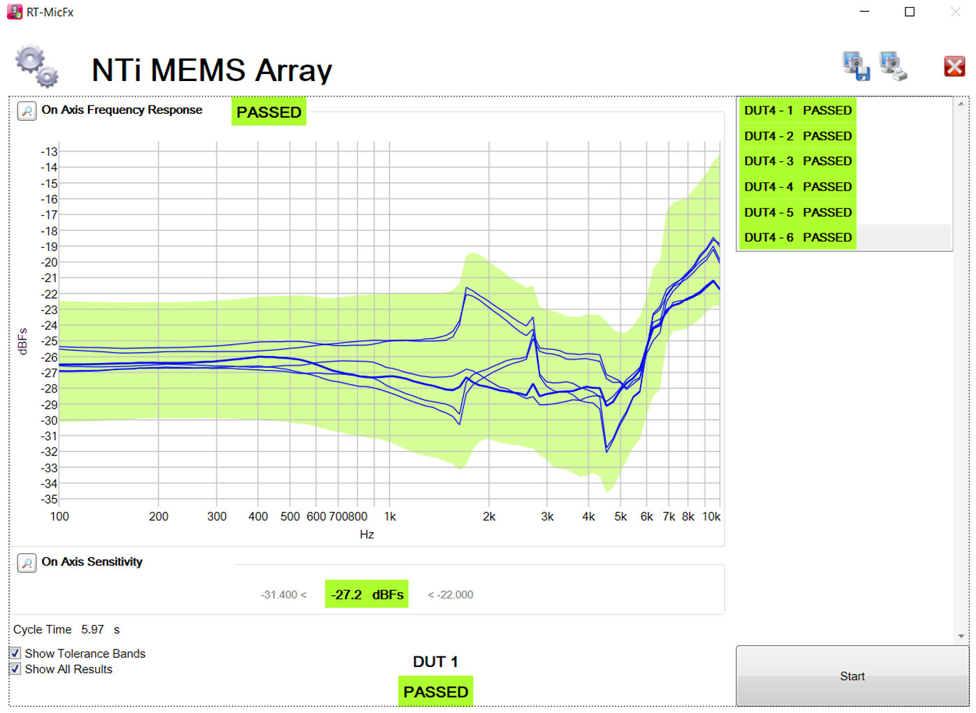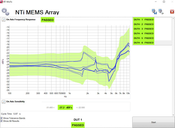 26. septembre 2019 Contrôle de la qualité des microphones MEMS numériques Avec l'utilisation croissante de la commande vocale, les microphones MEMS numériques trouvent leur place dans de plus en plus d'appareils dans les domaines des communications, du divertissement, de la mobilité, de la médecine et de la maison. En règle générale, plusieurs microphones MEMS sont installés en réseau dans chaque appareil afin de faciliter des fonctions telles que l'audition directionnelle et la suppression du bruit. Avec le système de test de microphone NTi Audio, la qualité de chacun des microphones MEMS numériques ainsi que celle du réseau de microphones dans son ensemble peut être mesurée rapidement et de manière fiable. L’analyseur audio FX100 est au cœur du système de test de microphone. Il se connecte aux microphones MEMS numériques par l'intermédiaire du boîtier d'interface microphones MEMS NTi Audio (NTi Audio MEMS Mic Interface Box). Jusqu'à 8 microphones MEMS numériques peuvent être évalués avec des fréquences d'horloge et des tensions d’alimentation configurables. Un haut-parleur de référence et un microphone de mesure assurent des signaux de test acoustiques précis et reproductibles. Schéma fonctionnel: Système de test pour microphones MEMS numériques Le logiciel NTi Audio RT-Mic PC NTi Audio coordonne tous les processus de mesure, visualise les résultats et les évalue en fonction de bons et mauvais critères. Les paramètres typiques d'un test sont la sensibilité, la réponse en fréquence, la distorsion et le rapport signal/bruit (SNR). Les résultats du module complet de microphones ainsi que les écarts de chaque microphone sont importants. Résultats de mesure d'un ensemble de six microphones MEMS numériques En savoir plus sur les procédures, les caractéristiques et les défis spécifiques liés à la mesure des microphones MEMS numériques. Vous souhaitez un conseil personnalisé pour votre projet? Contactez-nous! Autres liens vers le sujet: En savoir plus sur le contrôle qualité des réseaux de microphones MEMS numériques En savoir plus pour Tester des dispositifs intelligents En savoir plus sur l'analyseur audio Flexus FX100 Télécharger les photos icie Categories: Contrôle de la qualité Tags: