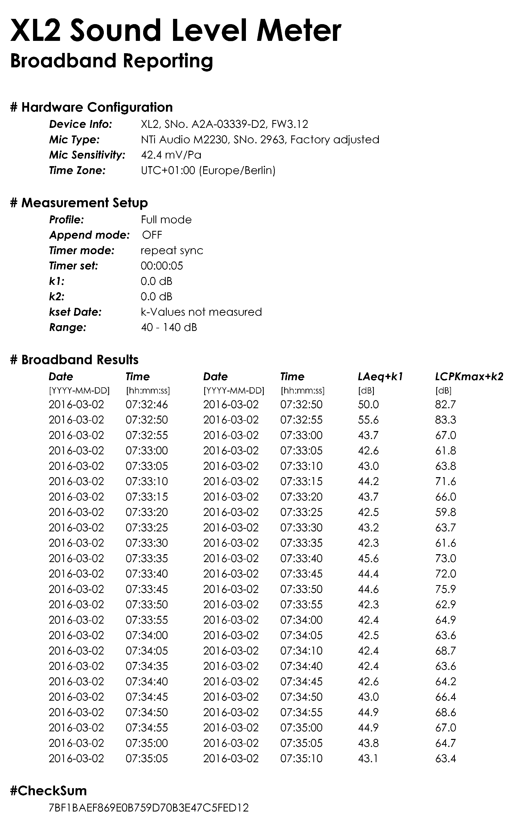 03. mars 2016 XL2 Reports with Certificate of Authenticity The XL2 Audio and Acoustic Analyzer automatically saves measurement data in plain text files. With the latest free product extension to the XL2, an encoded checksum is included within the data of each measurement file. This guarantees that the measurement data is original; that the reports have not been inadvertently changed by a third party. The hand-held XL2 Analyzer is a powerful Sound Level Meter, a professional Acoustic Analyzer and a precision Audio Analyzer in one instrument. During measurement, the instrument continually writes measurement data in text format (.txt files) to the SD card. These files can be opened with a text editor, e.g. Notepad or Wordpad, or be imported directly into MS Excel. Efficient Documentation of Measurement Data The XL2 Analyzer has a new feature. An encoded checksum is now added to each data file. This checksum ensures the authenticity of the test reports against manipulation attempts by a third party. Berno Nigsch, Product Manager of NTi Audio, says, "In the past customers used the XL2 screenshot function to prove the authenticity of the measurement data. This is now no longer necessary; the process of data validation is more secure. The authenticity of the data can be verified at any time by means of the checksum. The documentation process is now more efficient, giving XL2 customers more time to focus on their core competencies." File Validator Software confirms Authenticity The authenticity of an XL2 measurement file is confirmed using the "XL2 File Validator" PC software. This application compares the complete contents of a measurement file against the stored checksum. With a single press of a button, many measurement reports can be verified. In summary, Mr. Nigsch clarifies, "The checksum provides another quality feature for all XL2 users. It confirms the authenticity of the measurement data in the generated measurement reports while adding traceability." The XL2 Analyzer with firmware V3.12 or higher provides the checksums. All registered XL2 customers receive this enhancement with the free firmware update on the XL2 support page. The "XL2 File Validator" software is also available free of charge on this support page. Download latest XL2 Firmware here Download XL2 File Validator software here Download Sample Measurement Report here More about the XL2 Sound Level Meter Press Picture(s) for download here. Categories: Archive Tags: