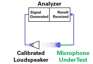 De même, dans un test de microphone en boucle fermée, l’analyseur est connecté directement aux fils à l’arrière du microphone testé. Nous lisons le signal de test via un haut-parleur calibré, et la réponse du microphone est enregistrée par l’analyseur.