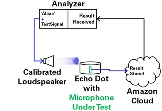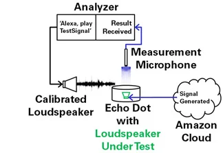 Pour tester l’ensemble de microphones dans l’Amazon Echo, nous n’avons pas non plus d’accès physique direct à l’arrière des microphones dans l’Echo lui-même (toujours sans détruire l’Echo). Le signal enregistré par les microphones Echo est stocké sur le Cloud Amazon et relu manuellement à l’analyseur. Comme l’analyseur n’est pas connecté directement aux microphones testés, nous avons ce qui est considéré comme un test de microphone en boucle ouverte.