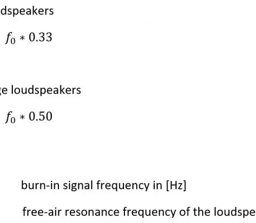 Le but du processus de rodage est d’atteindre des conditions mécaniques stables et établies. La période de temps requise pour atteindre ces conditions est différente pour chaque modèle de haut-parleur, et doit donc être évaluée individuellement. Une manière pratique de procéder est d’appliquer le signal de rodage et de mesurer les valeurs f_0 (fréquence de résonance à l’air libre) et R_0 (impédance de résonance à l’air libre) initialement, puis toutes les deux heures, jusqu’à ce qu’elles se stabilisent. Pour éviter toute interférence avec le comportement thermique des haut-parleurs, il est conseillé de laisser le haut-parleur refroidir avant d’effectuer les mesures f_0 et R_0.