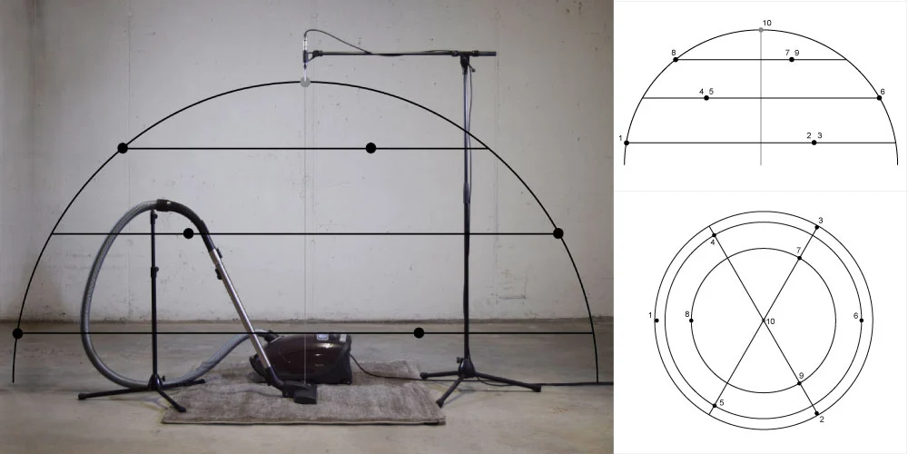 Positionnez dix microphones le long d’une enveloppe autour de l’équipement sous test (configuration hémisphérique), chacun avec une distance de préférence de 2 mètres et au moins un minimum de 1,5 mètre du centre du tapis.
