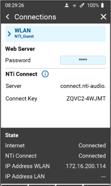 Dieses Setup zeigt den aktuellen Status der Wi-Fi Verbindung und die zugeordnete IP-Adresse des Gerätes an. Die IP-Adresse ist für die Verbindung mit dem Web-Server wichtig. Unter NTi Connect sehen sie die URL des Verbindungsservers und den eineindeutigen Schlüssel Ihres XL3. Dieser Schlüssel und das zu definierende Passwort werden für die Verbindung über NTI Connect benötigt. In inem internen LAN Netzwerk kann alternativ auch die IP Adresse für die Verbindung verwendet werden. |
