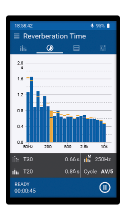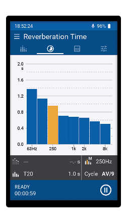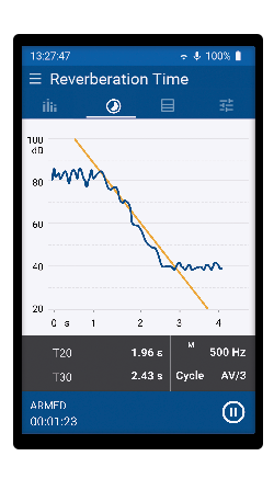 O XL3 mede o tempo de reverberação em bandas de oitava de 63 Hz – 8 kHz usando o T20 ou T30 padronizado. A sala pode ser excitada usando uma fonte de impulso ou um ruído rosa interrompido. O XL3 calcula a média de todos os decaimentos registrados para cada posição de medição automaticamente. Além disso, a instalação da Extended Room Acoustics Option permite a medição do tempo de reverberação em resolução de um terço de oitava, visualizando a curva de decaimento, calculando a média espacial da sala e a medição simultânea de T30/T20/T15/EDT no XL3 Acoustic Analyzer. Indicadores de qualidade adicionais, como linearidade e curvatura, descrevem a curva de decaimento de acordo com a norma ISO 3382-2. Um arquivo de áudio do decaimento de nível pode ser gravado para uma análise mais detalhada.