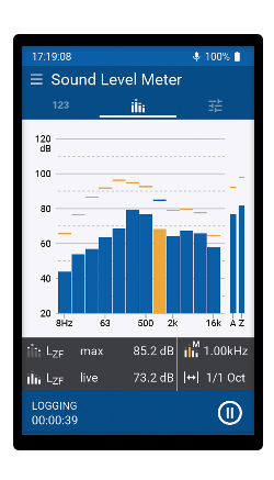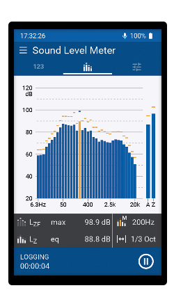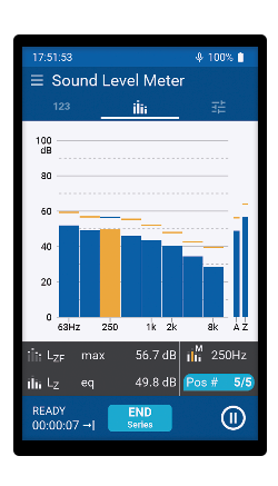 A medição do espectro de ruído adequa-se perfeitamente à optimização do som em salas. O XL3 determina o espectro de frequências com um banco de filtros de Classe 1 em oitava ou resolução de um terço de oitava entre 6,3 Hz e 20 kHz. Os níveis mínimo, máximo e médio de pressão sonora de todas as bandas de frequência são medidos em paralelo. O eixo de frequência pode ser livremente ampliado e rolado até, por exemplo, 125 Hz - 8 kHz, a gama de frequência típica de interesse para investigações acústicas de salas. O nível somado da gama de frequência seleccionada é mostrado na visualização do espectro ao mesmo tempo.