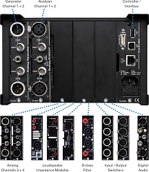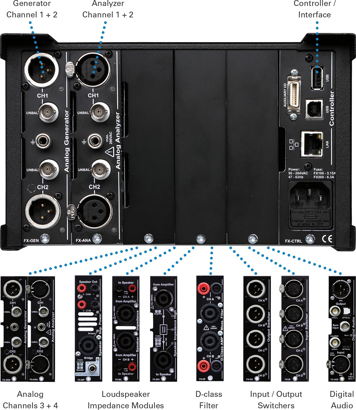 O conceito modular de hardware possibilita, entre outras coisas, expandir o FX100 de dois para quatro canais ou aparelhar ele com uma opção para a medição da impedância de alto-falantes ou similares. Assim, o analisador de áudio FLEXUS pode sempre ser adaptado para novos requisitos.